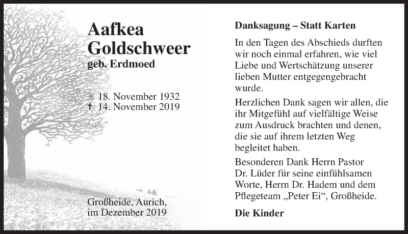 Hier finden Sie alle Traueranzeigen aus der Zeitung, die bisher für Aafkea Goldschweer erschienen sind. Weitere Traueranzeigen, die in der Zeitung erscheinen, werden hier ebenfalls aufgelistet