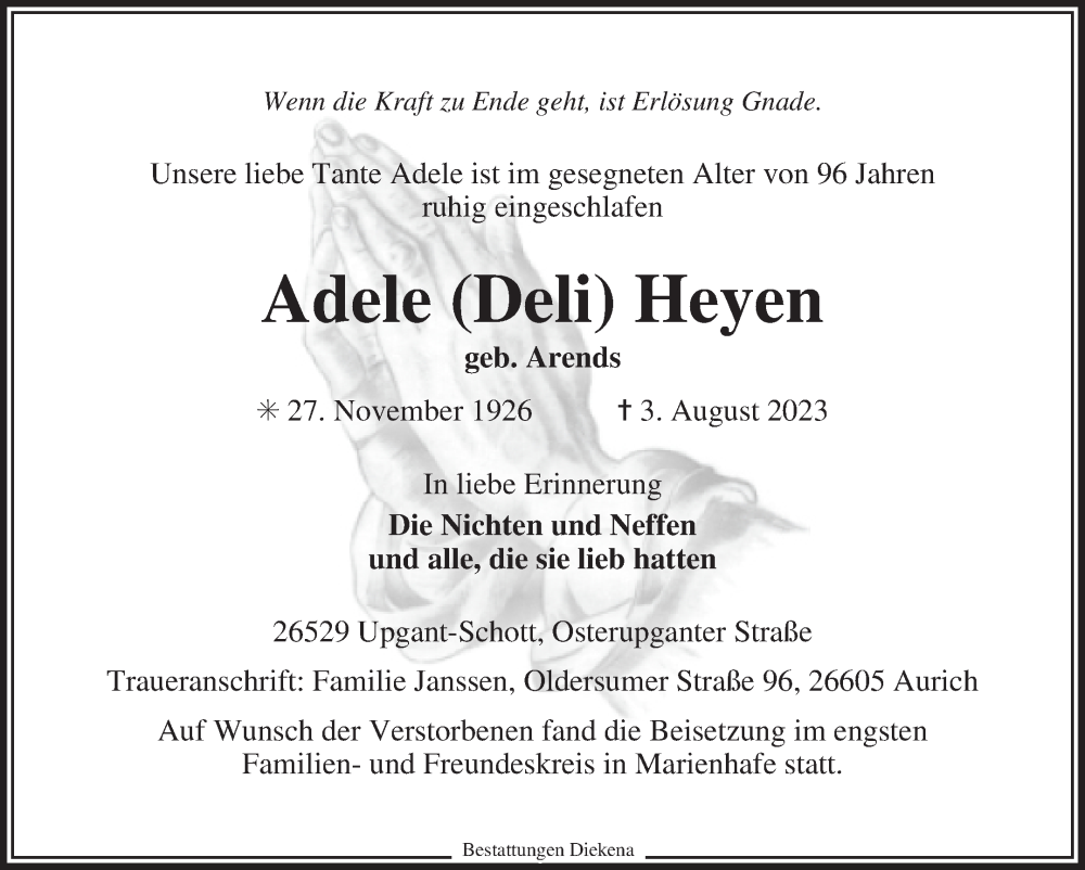 Hier finden Sie alle Traueranzeigen aus der Zeitung, die bisher für Adele Heyen erschienen sind. Weitere Traueranzeigen, die in der Zeitung erscheinen, werden hier ebenfalls aufgelistet