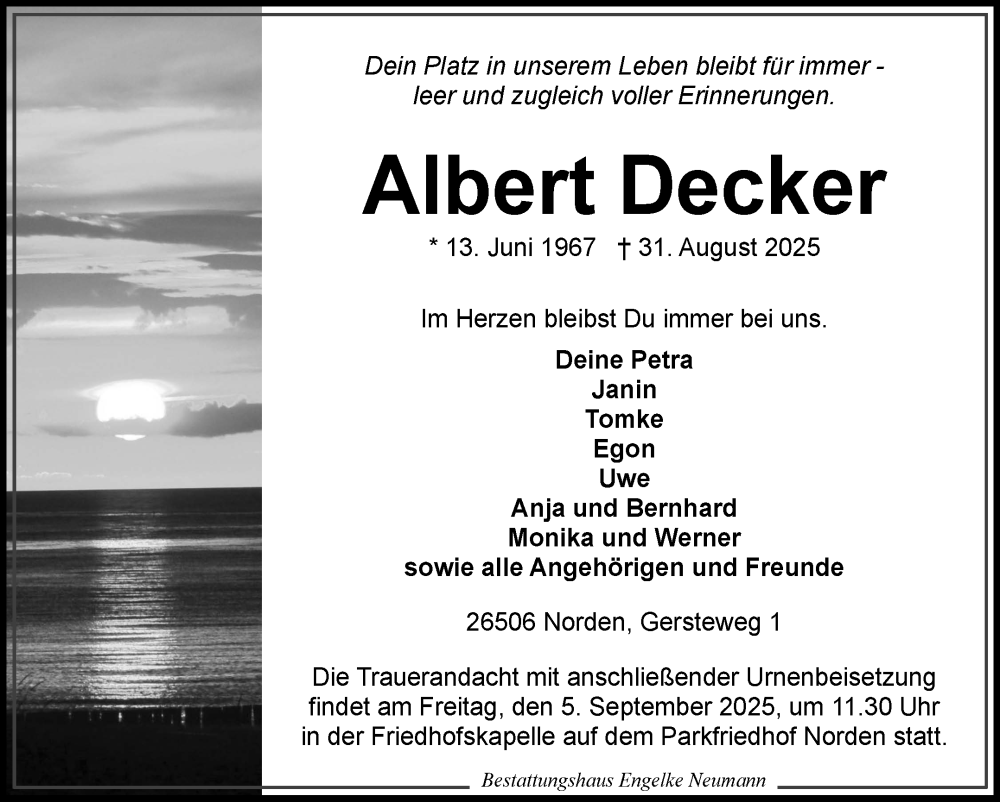 Hier finden Sie alle Traueranzeigen aus der Zeitung, die bisher für Albert Decker erschienen sind. Weitere Traueranzeigen, die in der Zeitung erscheinen, werden hier ebenfalls aufgelistet