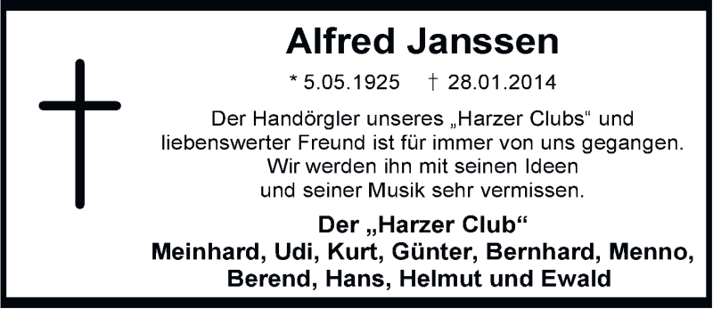 Hier finden Sie alle Traueranzeigen aus der Zeitung, die bisher für Alfred Janssen erschienen sind. Weitere Traueranzeigen, die in der Zeitung erscheinen, werden hier ebenfalls aufgelistet