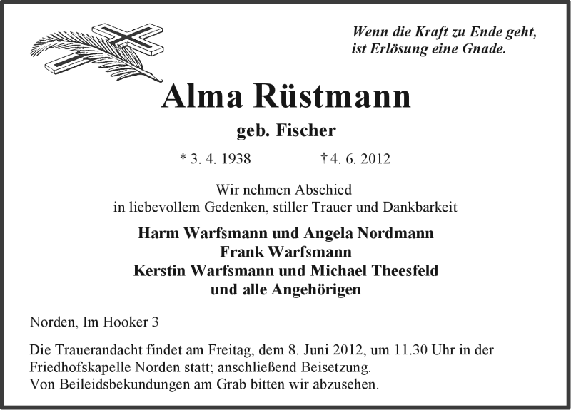 Hier finden Sie alle Traueranzeigen aus der Zeitung, die bisher für Alma Rüstmann erschienen sind. Weitere Traueranzeigen, die in der Zeitung erscheinen, werden hier ebenfalls aufgelistet