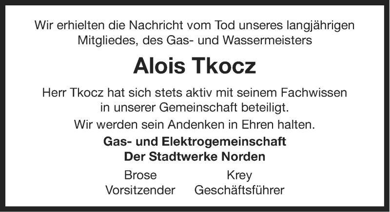 Hier finden Sie alle Traueranzeigen aus der Zeitung, die bisher für Alois Tkocz erschienen sind. Weitere Traueranzeigen, die in der Zeitung erscheinen, werden hier ebenfalls aufgelistet