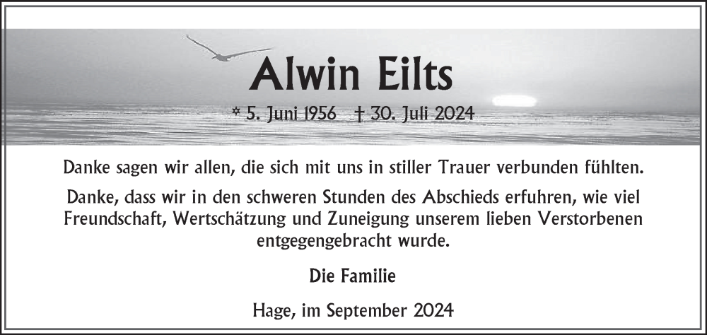 Hier finden Sie alle Traueranzeigen aus der Zeitung, die bisher für Alwin Eilts erschienen sind. Weitere Traueranzeigen, die in der Zeitung erscheinen, werden hier ebenfalls aufgelistet