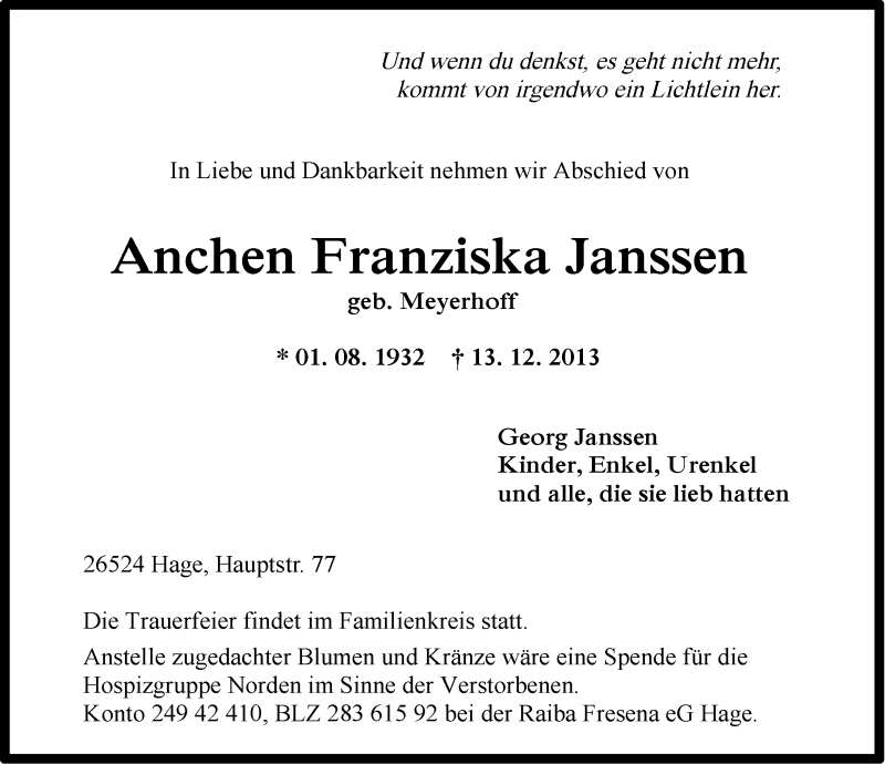 Hier finden Sie alle Traueranzeigen aus der Zeitung, die bisher für Anchen Franziska Janssen erschienen sind. Weitere Traueranzeigen, die in der Zeitung erscheinen, werden hier ebenfalls aufgelistet