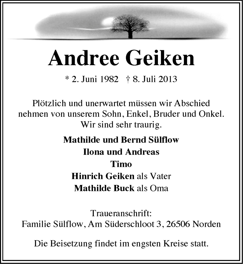Hier finden Sie alle Traueranzeigen aus der Zeitung, die bisher für Andree Geiken erschienen sind. Weitere Traueranzeigen, die in der Zeitung erscheinen, werden hier ebenfalls aufgelistet