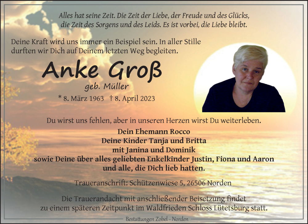 Hier finden Sie alle Traueranzeigen aus der Zeitung, die bisher für Anke Groß erschienen sind. Weitere Traueranzeigen, die in der Zeitung erscheinen, werden hier ebenfalls aufgelistet