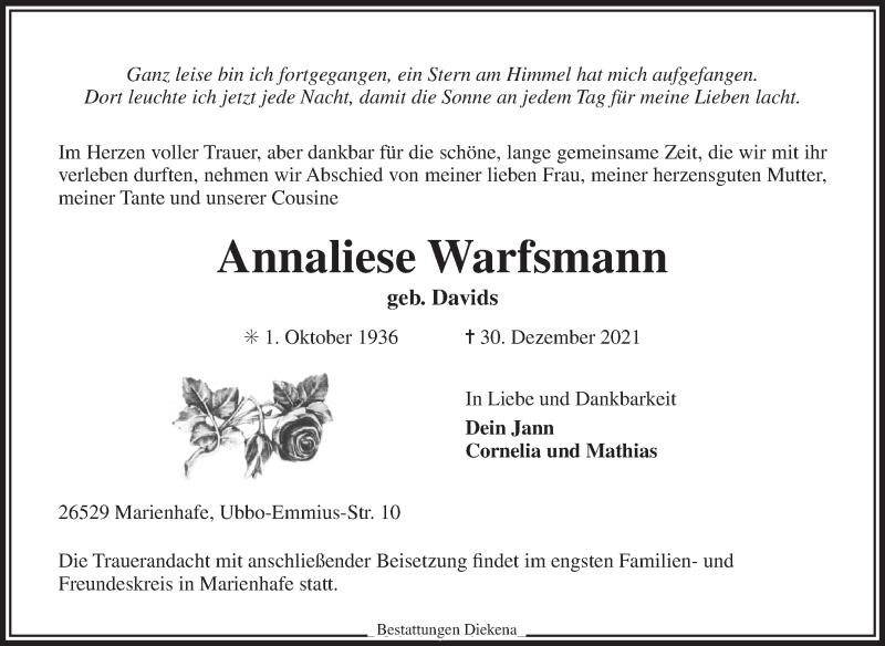 Hier finden Sie alle Traueranzeigen aus der Zeitung, die bisher für Annaliese Warfsmann erschienen sind. Weitere Traueranzeigen, die in der Zeitung erscheinen, werden hier ebenfalls aufgelistet