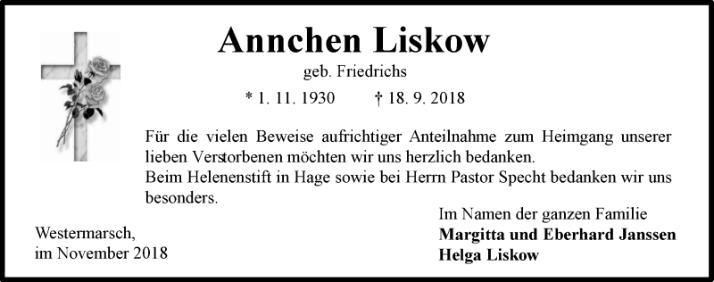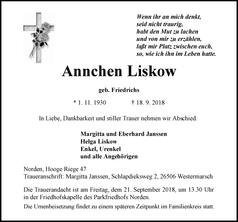 Hier finden Sie alle Traueranzeigen aus der Zeitung, die bisher für Annchen Liskow erschienen sind. Weitere Traueranzeigen, die in der Zeitung erscheinen, werden hier ebenfalls aufgelistet