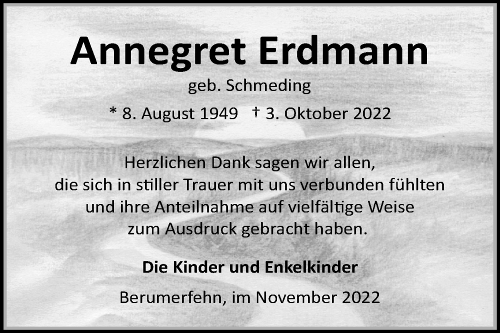 Hier finden Sie alle Traueranzeigen aus der Zeitung, die bisher für Annegret Erdmann erschienen sind. Weitere Traueranzeigen, die in der Zeitung erscheinen, werden hier ebenfalls aufgelistet