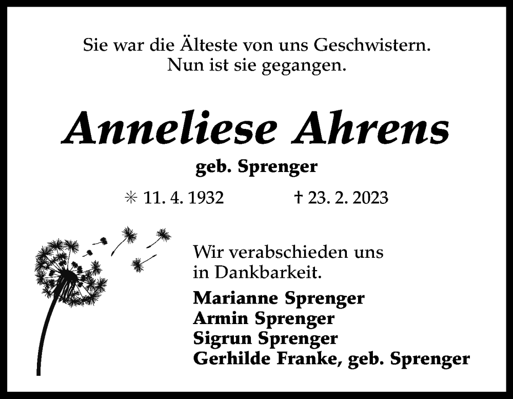 Hier finden Sie alle Traueranzeigen aus der Zeitung, die bisher für Anneliese Ahrens erschienen sind. Weitere Traueranzeigen, die in der Zeitung erscheinen, werden hier ebenfalls aufgelistet