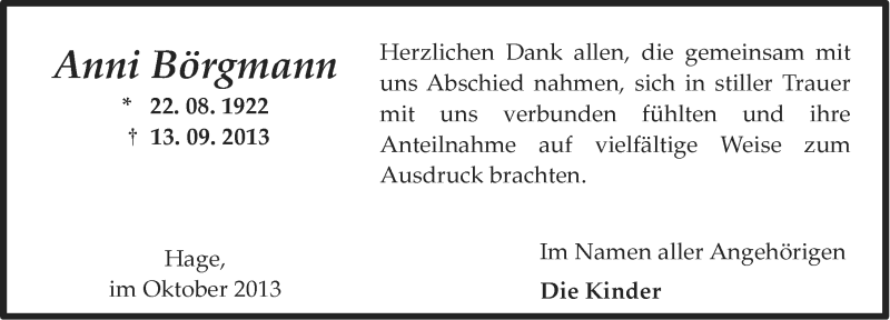 Hier finden Sie alle Traueranzeigen aus der Zeitung, die bisher für Anni Börgmann erschienen sind. Weitere Traueranzeigen, die in der Zeitung erscheinen, werden hier ebenfalls aufgelistet