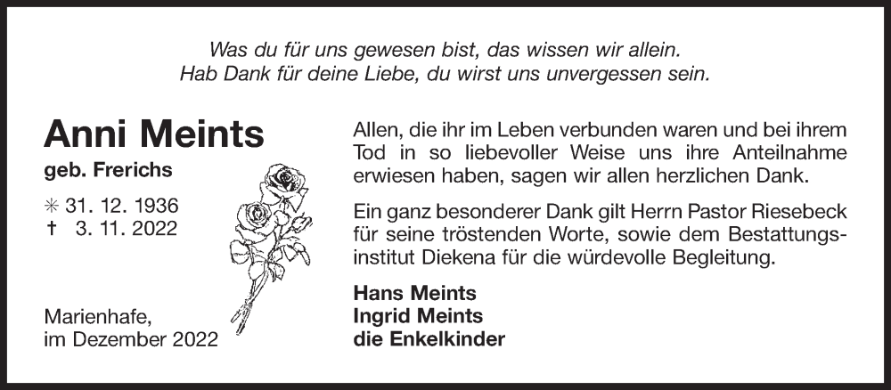 Hier finden Sie alle Traueranzeigen aus der Zeitung, die bisher für Anni Meints erschienen sind. Weitere Traueranzeigen, die in der Zeitung erscheinen, werden hier ebenfalls aufgelistet