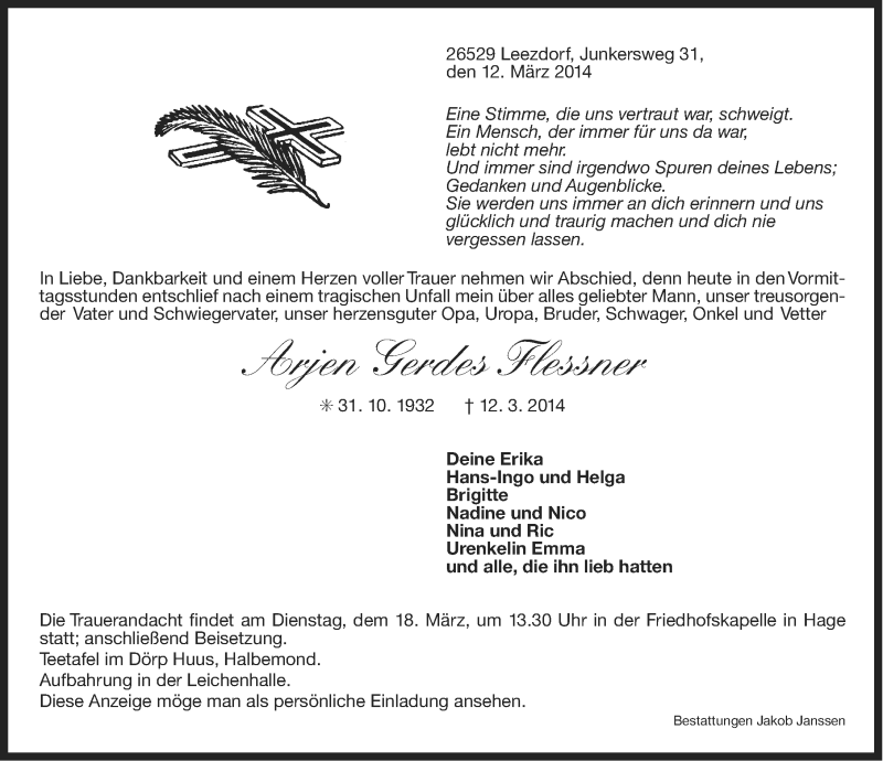 Hier finden Sie alle Traueranzeigen aus der Zeitung, die bisher für Arjen Gerdes Flessner erschienen sind. Weitere Traueranzeigen, die in der Zeitung erscheinen, werden hier ebenfalls aufgelistet