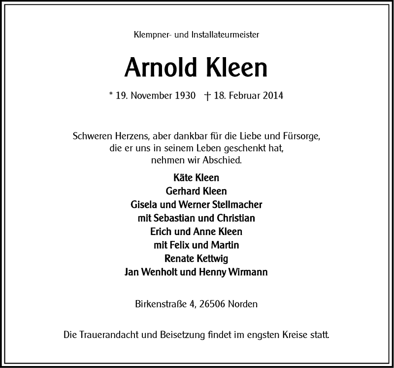 Hier finden Sie alle Traueranzeigen aus der Zeitung, die bisher für Arnold Kleen erschienen sind. Weitere Traueranzeigen, die in der Zeitung erscheinen, werden hier ebenfalls aufgelistet