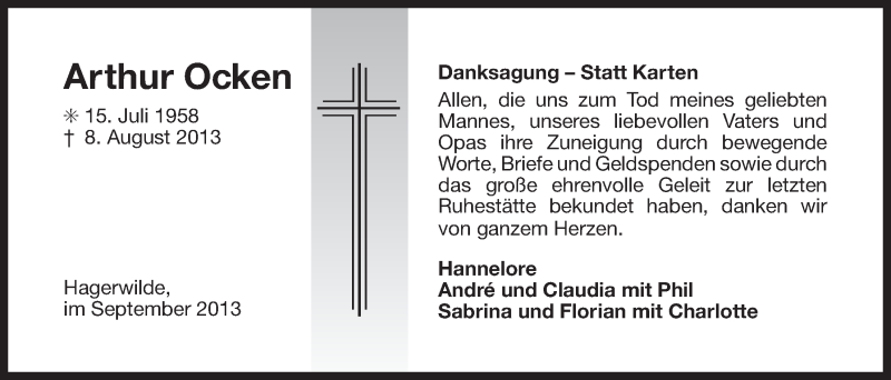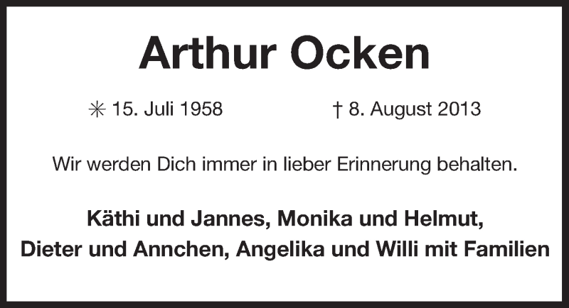 Hier finden Sie alle Traueranzeigen aus der Zeitung, die bisher für Arthur Ocken erschienen sind. Weitere Traueranzeigen, die in der Zeitung erscheinen, werden hier ebenfalls aufgelistet