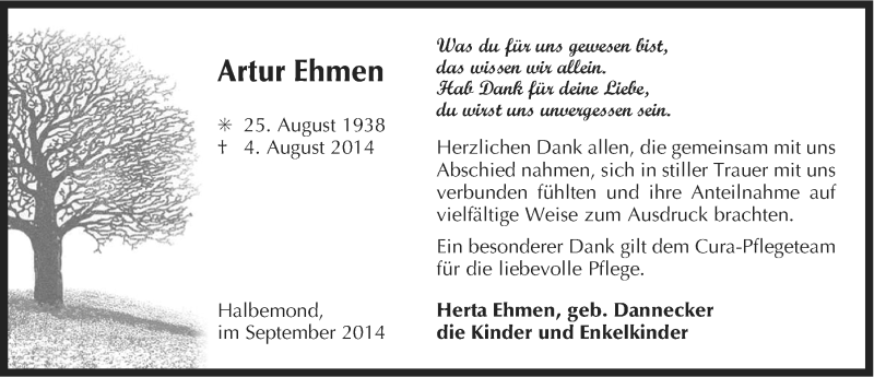 Hier finden Sie alle Traueranzeigen aus der Zeitung, die bisher für Artur Ehmen erschienen sind. Weitere Traueranzeigen, die in der Zeitung erscheinen, werden hier ebenfalls aufgelistet