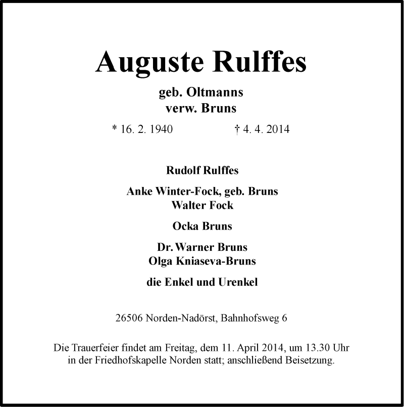 Hier finden Sie alle Traueranzeigen aus der Zeitung, die bisher für Auguste Rulffes erschienen sind. Weitere Traueranzeigen, die in der Zeitung erscheinen, werden hier ebenfalls aufgelistet