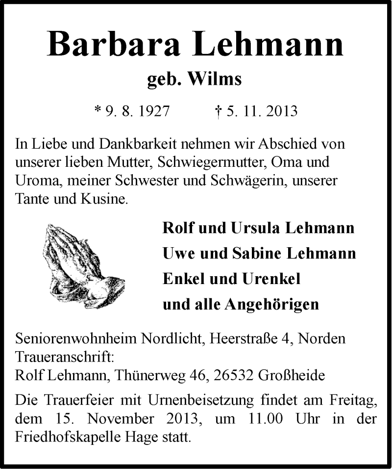 Hier finden Sie alle Traueranzeigen aus der Zeitung, die bisher für Barbara Lehmann erschienen sind. Weitere Traueranzeigen, die in der Zeitung erscheinen, werden hier ebenfalls aufgelistet