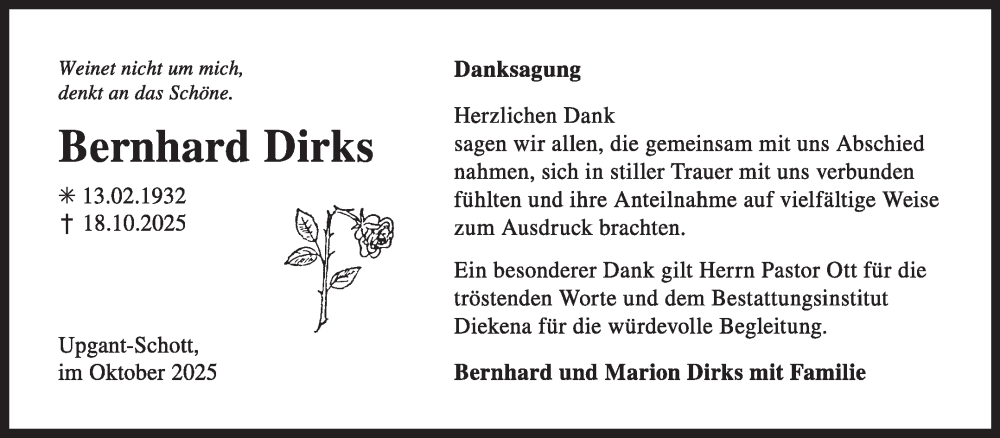 Hier finden Sie alle Traueranzeigen aus der Zeitung, die bisher für Bernhard Dirks erschienen sind. Weitere Traueranzeigen, die in der Zeitung erscheinen, werden hier ebenfalls aufgelistet