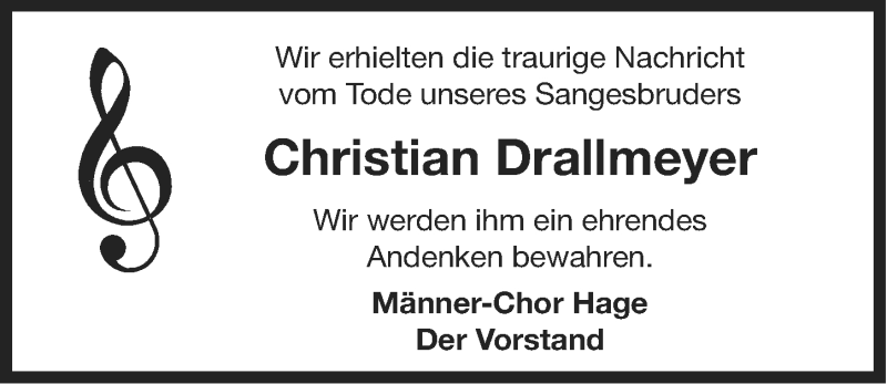 Hier finden Sie alle Traueranzeigen aus der Zeitung, die bisher für Christian Drallmeyer erschienen sind. Weitere Traueranzeigen, die in der Zeitung erscheinen, werden hier ebenfalls aufgelistet