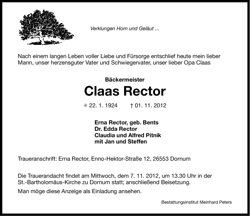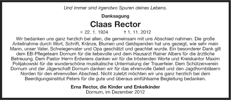 Hier finden Sie alle Traueranzeigen aus der Zeitung, die bisher für Claas Rector erschienen sind. Weitere Traueranzeigen, die in der Zeitung erscheinen, werden hier ebenfalls aufgelistet