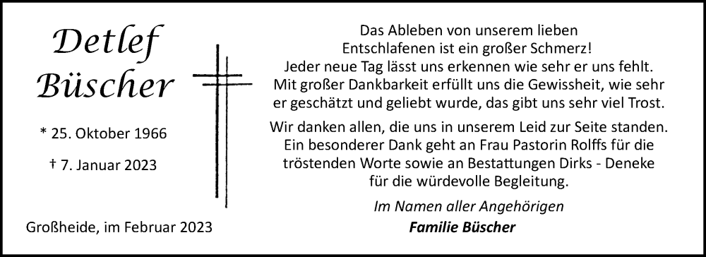 Hier finden Sie alle Traueranzeigen aus der Zeitung, die bisher für Detlef Büscher erschienen sind. Weitere Traueranzeigen, die in der Zeitung erscheinen, werden hier ebenfalls aufgelistet