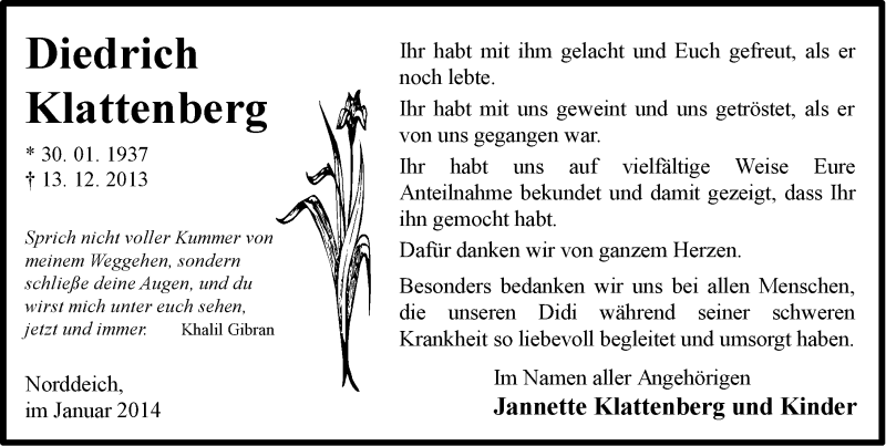 Hier finden Sie alle Traueranzeigen aus der Zeitung, die bisher für Diedrich Klattenberg erschienen sind. Weitere Traueranzeigen, die in der Zeitung erscheinen, werden hier ebenfalls aufgelistet