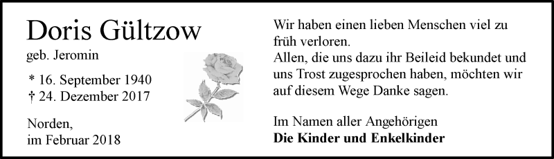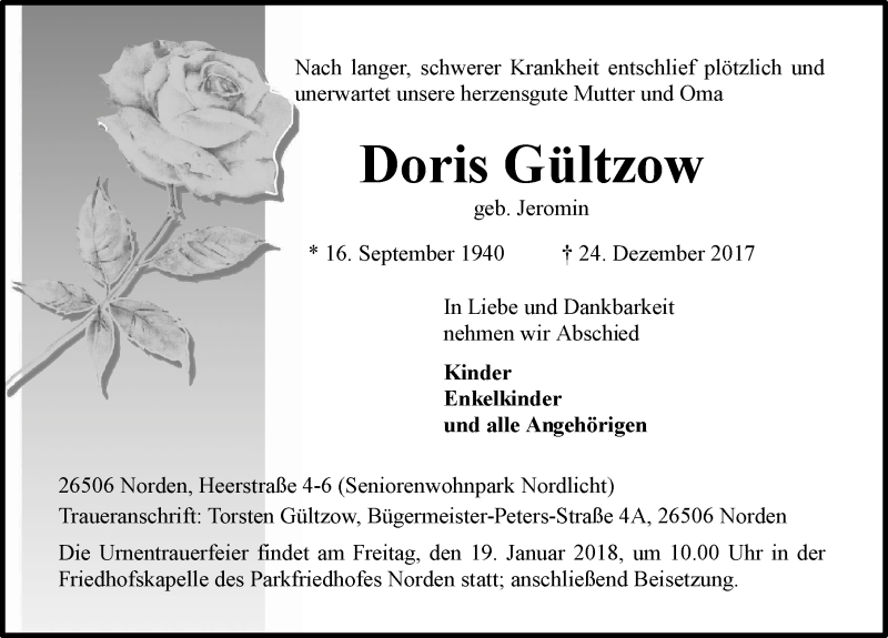 Hier finden Sie alle Traueranzeigen aus der Zeitung, die bisher für Doris Gültzow erschienen sind. Weitere Traueranzeigen, die in der Zeitung erscheinen, werden hier ebenfalls aufgelistet