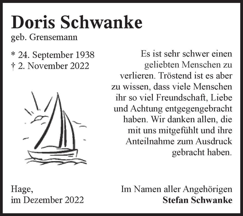 Hier finden Sie alle Traueranzeigen aus der Zeitung, die bisher für Doris Schwanke erschienen sind. Weitere Traueranzeigen, die in der Zeitung erscheinen, werden hier ebenfalls aufgelistet