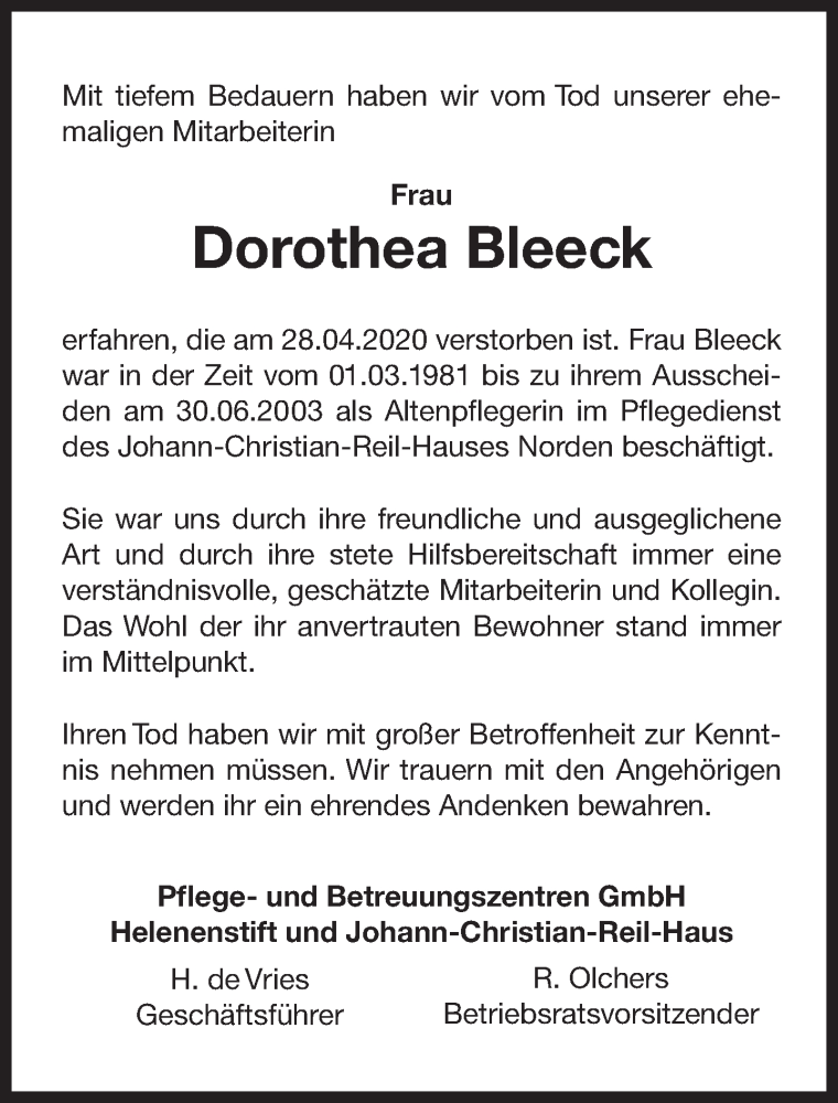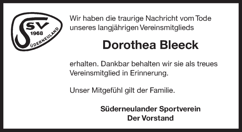 Hier finden Sie alle Traueranzeigen aus der Zeitung, die bisher für Dorothea Bleeck erschienen sind. Weitere Traueranzeigen, die in der Zeitung erscheinen, werden hier ebenfalls aufgelistet