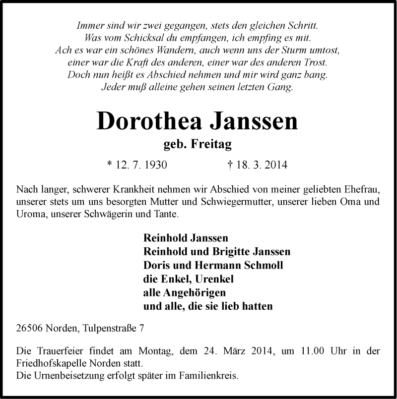 Hier finden Sie alle Traueranzeigen aus der Zeitung, die bisher für Dorothea Janssen erschienen sind. Weitere Traueranzeigen, die in der Zeitung erscheinen, werden hier ebenfalls aufgelistet