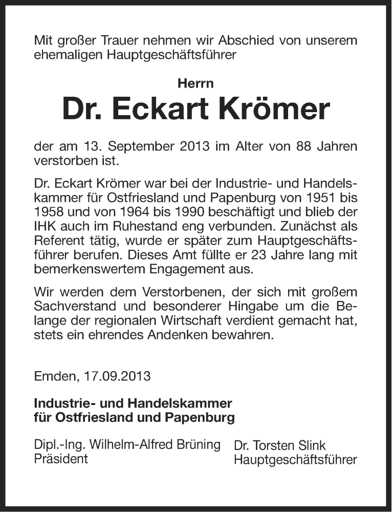 Hier finden Sie alle Traueranzeigen aus der Zeitung, die bisher für Eckart Krömer erschienen sind. Weitere Traueranzeigen, die in der Zeitung erscheinen, werden hier ebenfalls aufgelistet