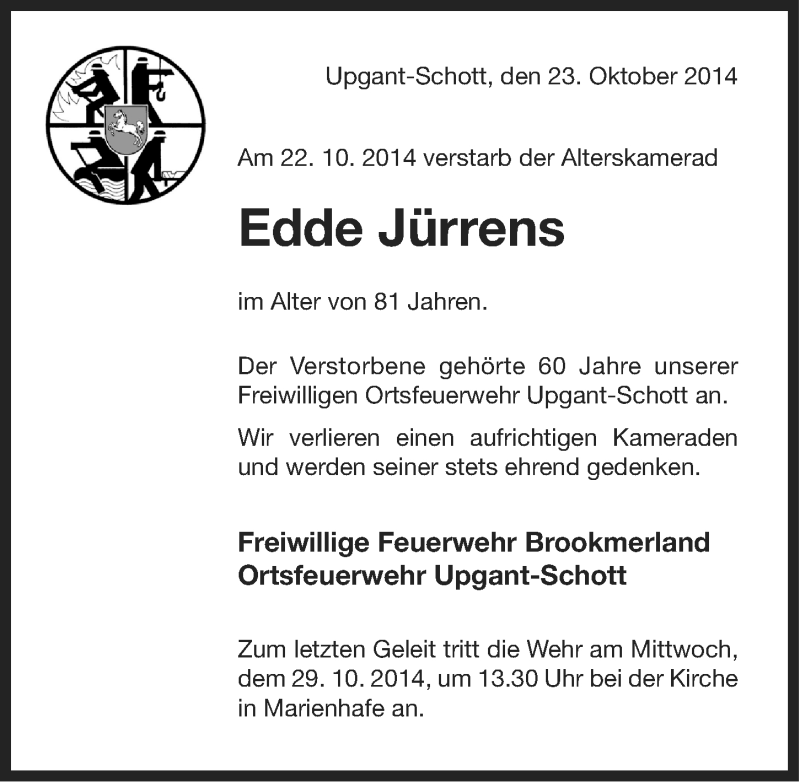 Hier finden Sie alle Traueranzeigen aus der Zeitung, die bisher für Edde Jürrens erschienen sind. Weitere Traueranzeigen, die in der Zeitung erscheinen, werden hier ebenfalls aufgelistet