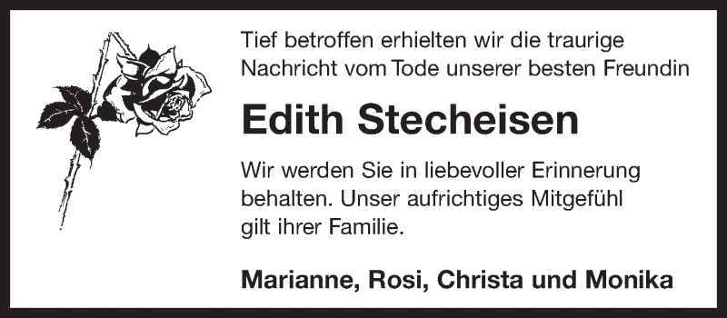 Hier finden Sie alle Traueranzeigen aus der Zeitung, die bisher für Edith Stecheisen erschienen sind. Weitere Traueranzeigen, die in der Zeitung erscheinen, werden hier ebenfalls aufgelistet