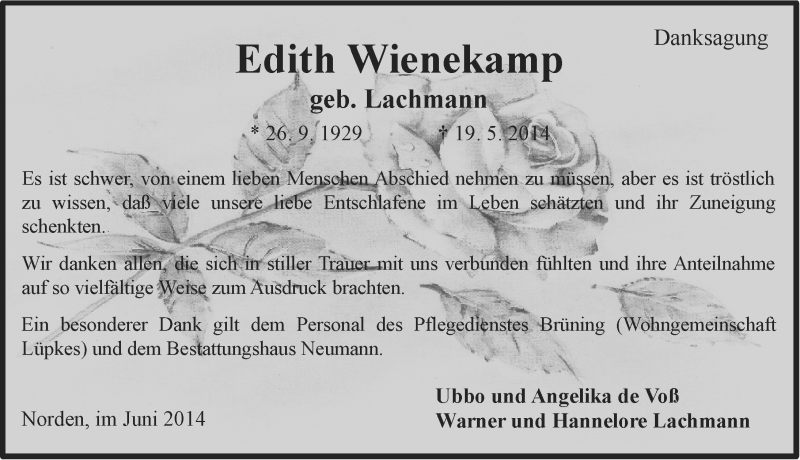 Hier finden Sie alle Traueranzeigen aus der Zeitung, die bisher für Edith Wienekamp erschienen sind. Weitere Traueranzeigen, die in der Zeitung erscheinen, werden hier ebenfalls aufgelistet