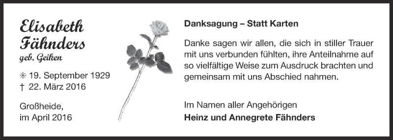 Hier finden Sie alle Traueranzeigen aus der Zeitung, die bisher für Eilsabeth Fähnders erschienen sind. Weitere Traueranzeigen, die in der Zeitung erscheinen, werden hier ebenfalls aufgelistet