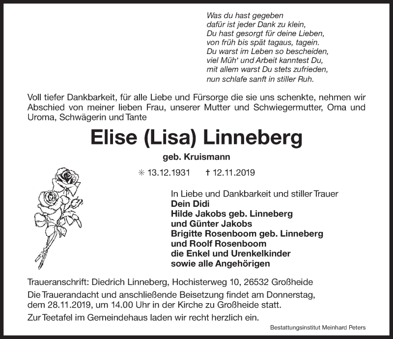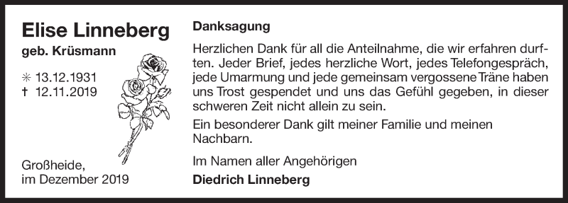 Hier finden Sie alle Traueranzeigen aus der Zeitung, die bisher für Elise Linneberg erschienen sind. Weitere Traueranzeigen, die in der Zeitung erscheinen, werden hier ebenfalls aufgelistet
