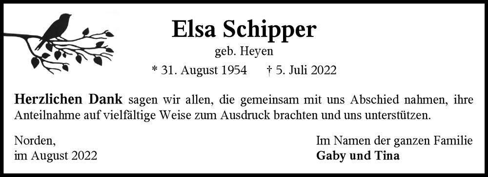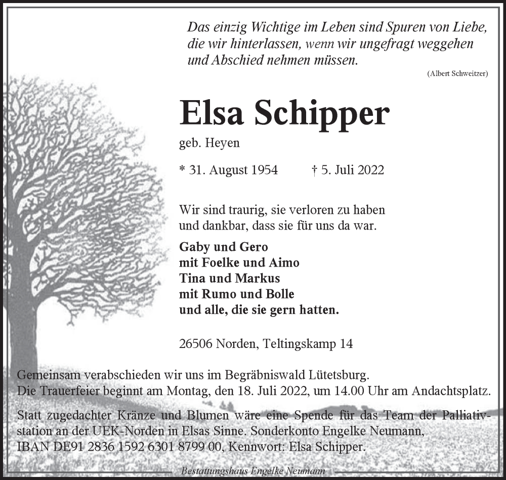 Hier finden Sie alle Traueranzeigen aus der Zeitung, die bisher für Elsa Schipper erschienen sind. Weitere Traueranzeigen, die in der Zeitung erscheinen, werden hier ebenfalls aufgelistet