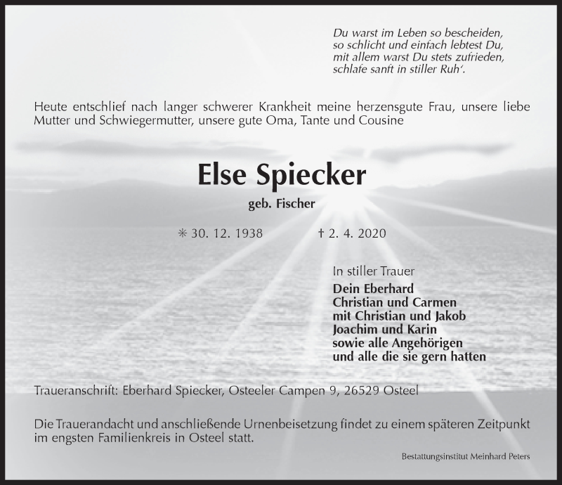 Hier finden Sie alle Traueranzeigen aus der Zeitung, die bisher für Else Spiecker erschienen sind. Weitere Traueranzeigen, die in der Zeitung erscheinen, werden hier ebenfalls aufgelistet