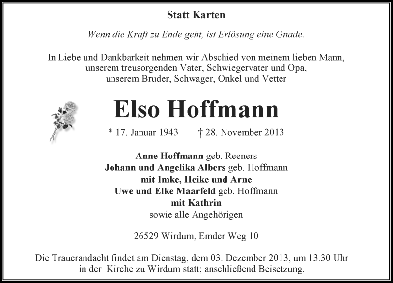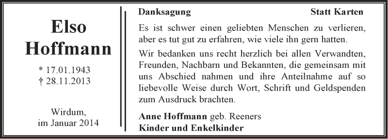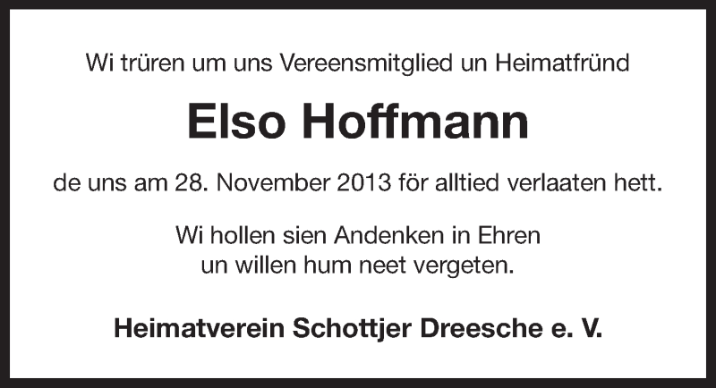 Hier finden Sie alle Traueranzeigen aus der Zeitung, die bisher für Elso Hoffmann erschienen sind. Weitere Traueranzeigen, die in der Zeitung erscheinen, werden hier ebenfalls aufgelistet