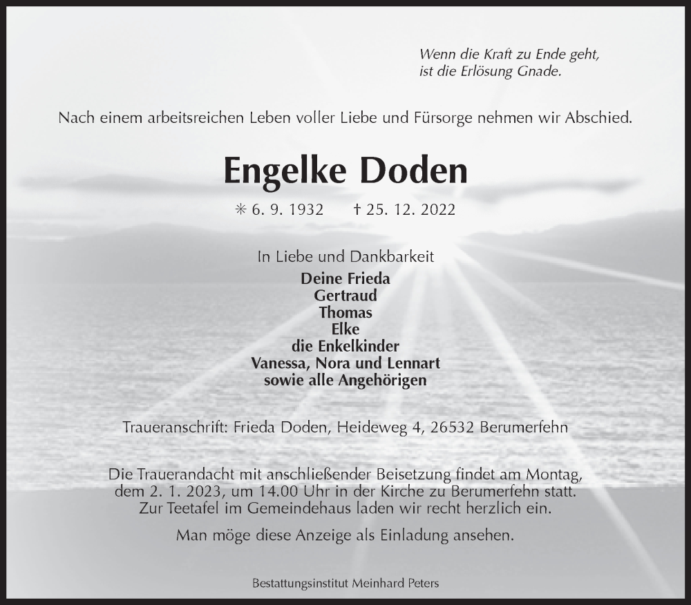 Hier finden Sie alle Traueranzeigen aus der Zeitung, die bisher für Engelke Doden erschienen sind. Weitere Traueranzeigen, die in der Zeitung erscheinen, werden hier ebenfalls aufgelistet