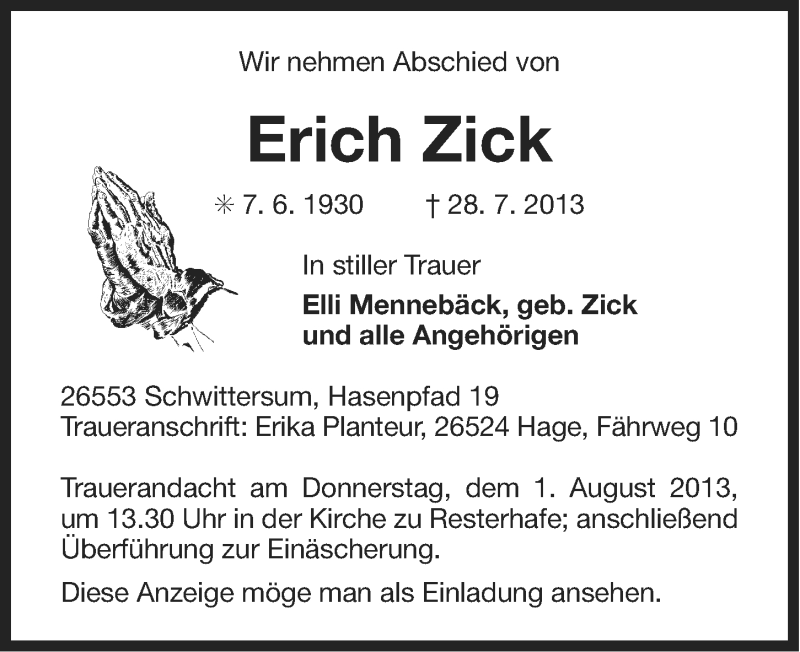 Hier finden Sie alle Traueranzeigen aus der Zeitung, die bisher für Erich Zick erschienen sind. Weitere Traueranzeigen, die in der Zeitung erscheinen, werden hier ebenfalls aufgelistet