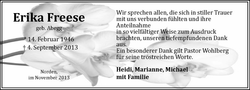 Hier finden Sie alle Traueranzeigen aus der Zeitung, die bisher für Erika Freese erschienen sind. Weitere Traueranzeigen, die in der Zeitung erscheinen, werden hier ebenfalls aufgelistet