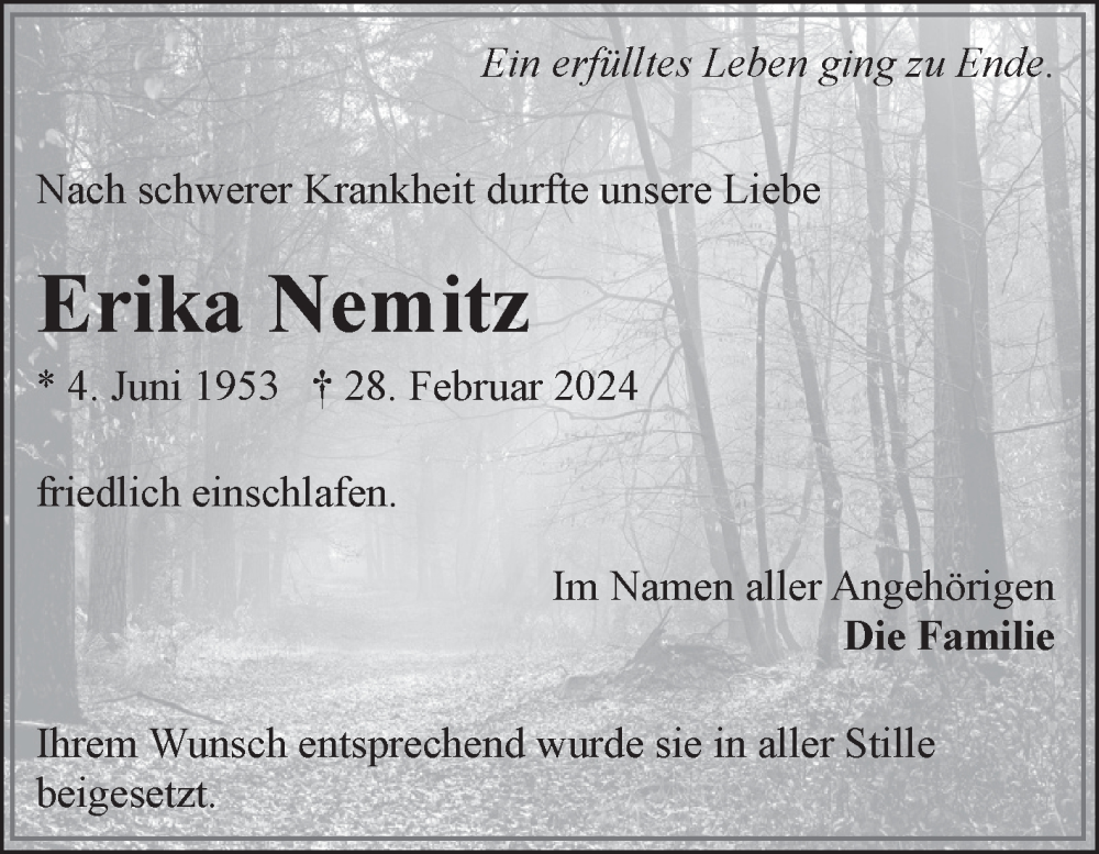 Hier finden Sie alle Traueranzeigen aus der Zeitung, die bisher für Erika Nemitz erschienen sind. Weitere Traueranzeigen, die in der Zeitung erscheinen, werden hier ebenfalls aufgelistet