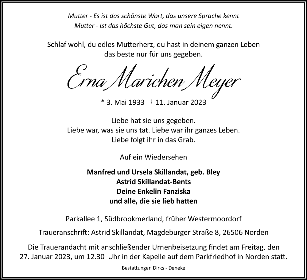 Hier finden Sie alle Traueranzeigen aus der Zeitung, die bisher für Erna Marichen Meyer erschienen sind. Weitere Traueranzeigen, die in der Zeitung erscheinen, werden hier ebenfalls aufgelistet