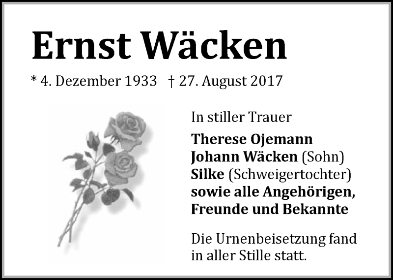 Hier finden Sie alle Traueranzeigen aus der Zeitung, die bisher für Ernst Wäcken erschienen sind. Weitere Traueranzeigen, die in der Zeitung erscheinen, werden hier ebenfalls aufgelistet