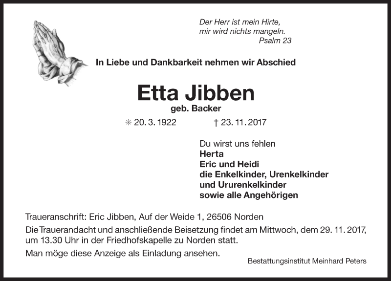 Hier finden Sie alle Traueranzeigen aus der Zeitung, die bisher für Etta Jibben erschienen sind. Weitere Traueranzeigen, die in der Zeitung erscheinen, werden hier ebenfalls aufgelistet