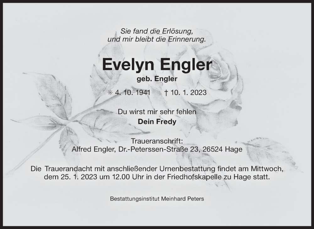 Hier finden Sie alle Traueranzeigen aus der Zeitung, die bisher für Evelyn Engler erschienen sind. Weitere Traueranzeigen, die in der Zeitung erscheinen, werden hier ebenfalls aufgelistet