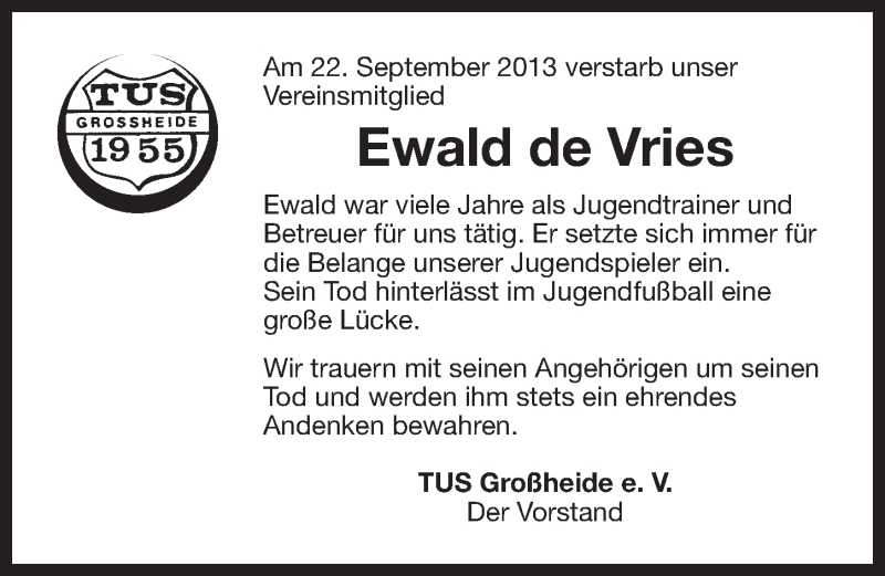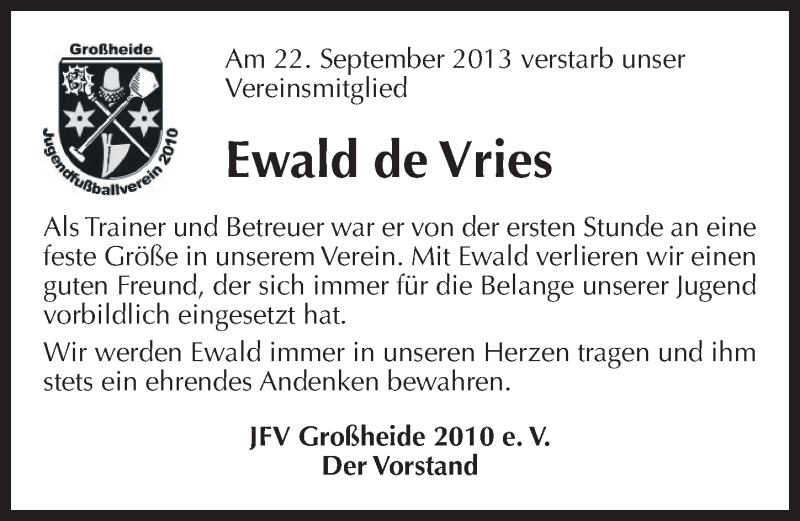 Hier finden Sie alle Traueranzeigen aus der Zeitung, die bisher für Ewald de Vries erschienen sind. Weitere Traueranzeigen, die in der Zeitung erscheinen, werden hier ebenfalls aufgelistet