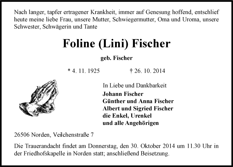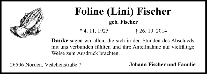 Hier finden Sie alle Traueranzeigen aus der Zeitung, die bisher für Foline Fischer erschienen sind. Weitere Traueranzeigen, die in der Zeitung erscheinen, werden hier ebenfalls aufgelistet